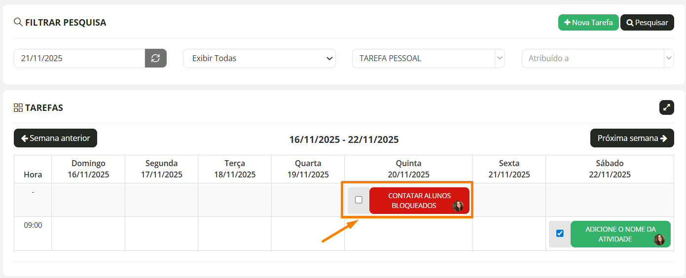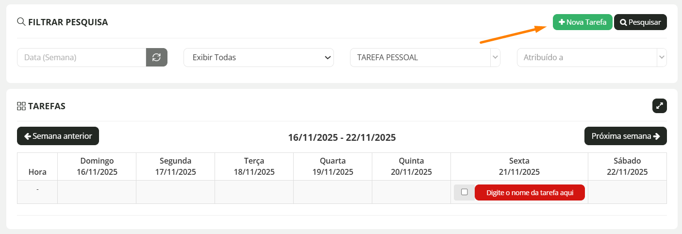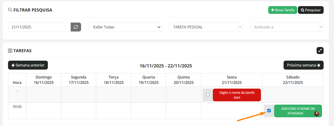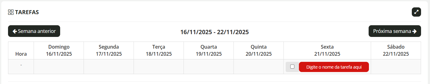 Aqui podemos consultar a lista de tarefas criadas por semana: