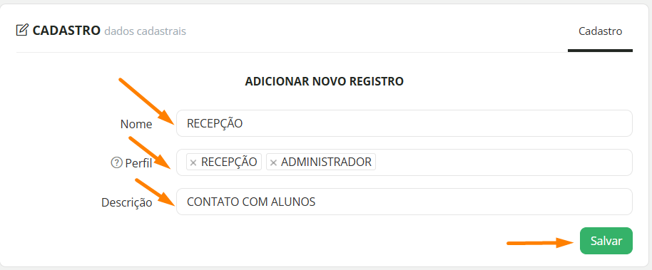 * Perfil: Insira o perfil, ou perfis, de acesso que serão atribuídos às tarefas.