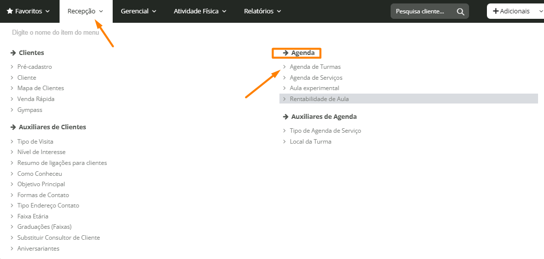 - Acesse Recepção > Agenda > Agenda de Turmas: