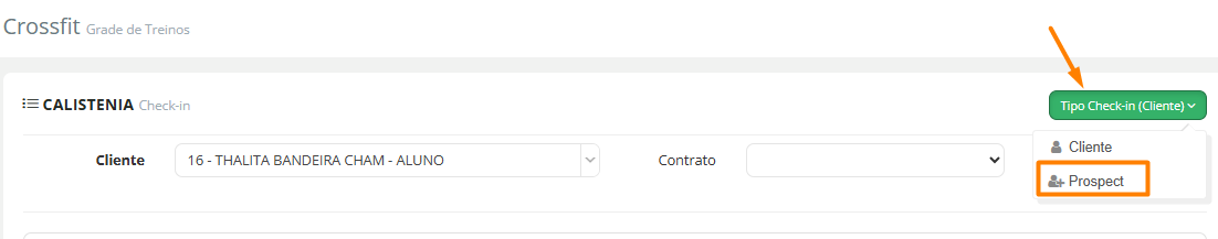 - Para incluir um check-in de aula experimental, mude o tipo de check-in para "Prospect":