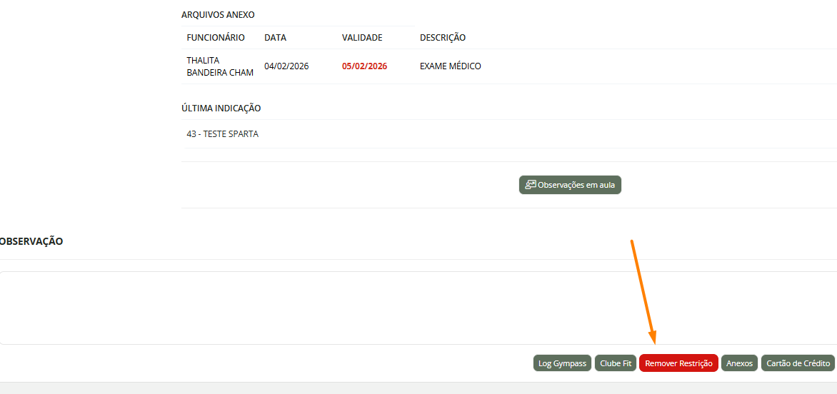 Quando necessário, é possível aplicar uma restrição temporária a um aluno dentro do sistema. Essa ação impede que ele realize check-ins até que a situação seja regularizada.