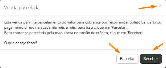 - Após finalizar a venda, você pode escolher entre parcelar o valor ou fazer o recebimento. Caso queira decidir depois, basta clicar no "x":