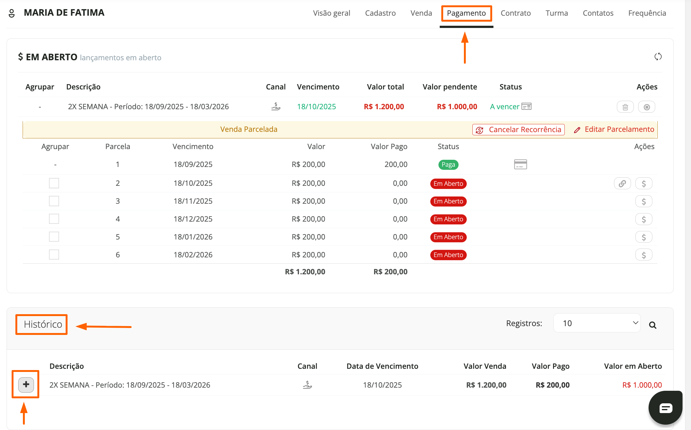 1. Acesse o perfil do aluno em Recepção > Clientes > Cliente.