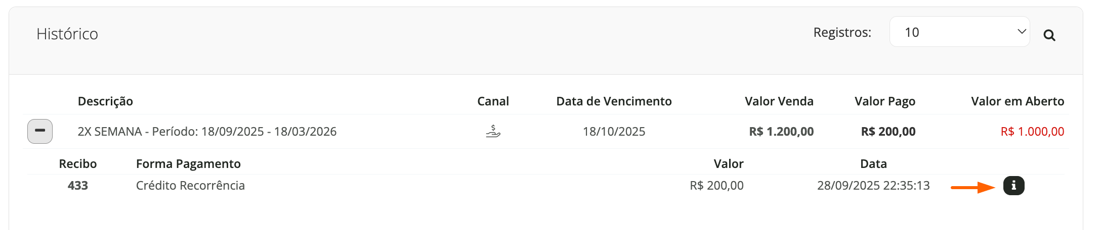 3. Clique no + e em seguida ni ( i ) para expandir e visualizar a fatura e o recibo.