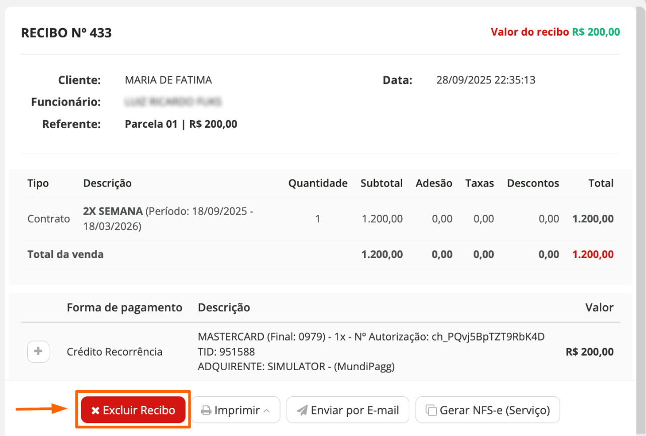 O Estorno Completo é simples de ser realizado pelo sistema, bastando excluir o recibo da fatura do aluno. Esse procedimento gera automaticamente a solicitação de estorno junto ao gateway, respeitando os prazos e regras de cada adquirente.