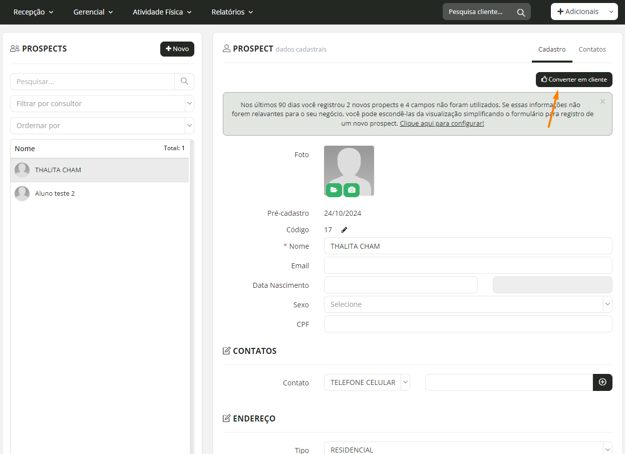 Utilizando o Tecnofit Starter, é possível cadastrar prospects de forma simples e rápida, permitindo que você acompanhe o interesse de potenciais clientes e crie estratégias eficazes para convertê-los em alunos ativos.