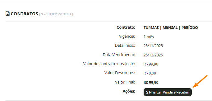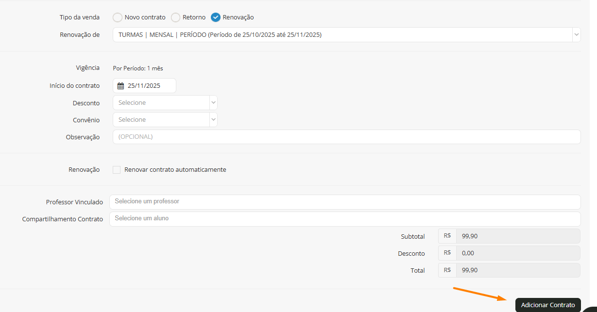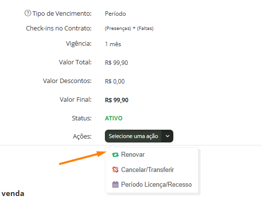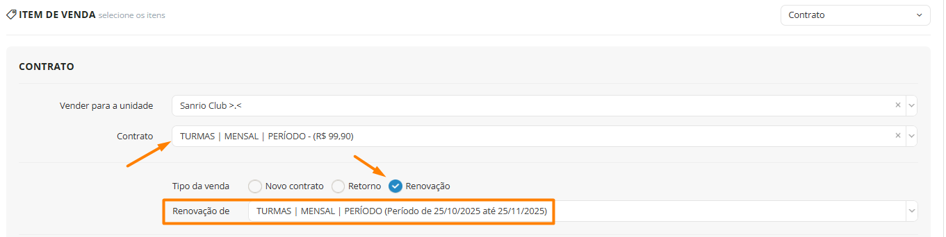 ⚠ Importante: Os dois contratos precisam ser exatamente iguais para que a renovação aconteça. Se desejar vender um contrato diferente do que está sendo renovado, será necessário realizar a venda como um novo contrato.