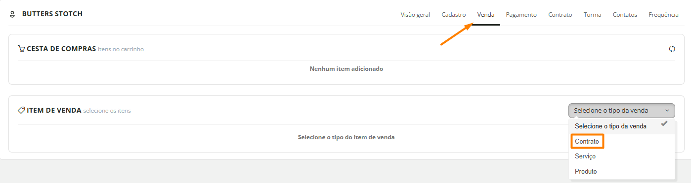 2. Na aba "Venda", selecione o tipo da venda como "Contrato":
